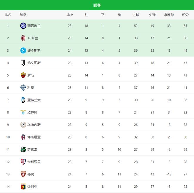 目前意甲积分榜如下:国际米兰依旧领跑,18胜1平4负积55分,占据主动;AC米兰以50分紧追其后;那不勒斯凭借这场极限绝杀来到49分,但比前两名多赛一场,容错空间并不大。尤文图斯45分暂列第四,罗马、科莫紧随其后,争四集团之间的差距不大,而亚特兰大、拉齐奥的起伏表现,也让欧战资格之争充满变数。
